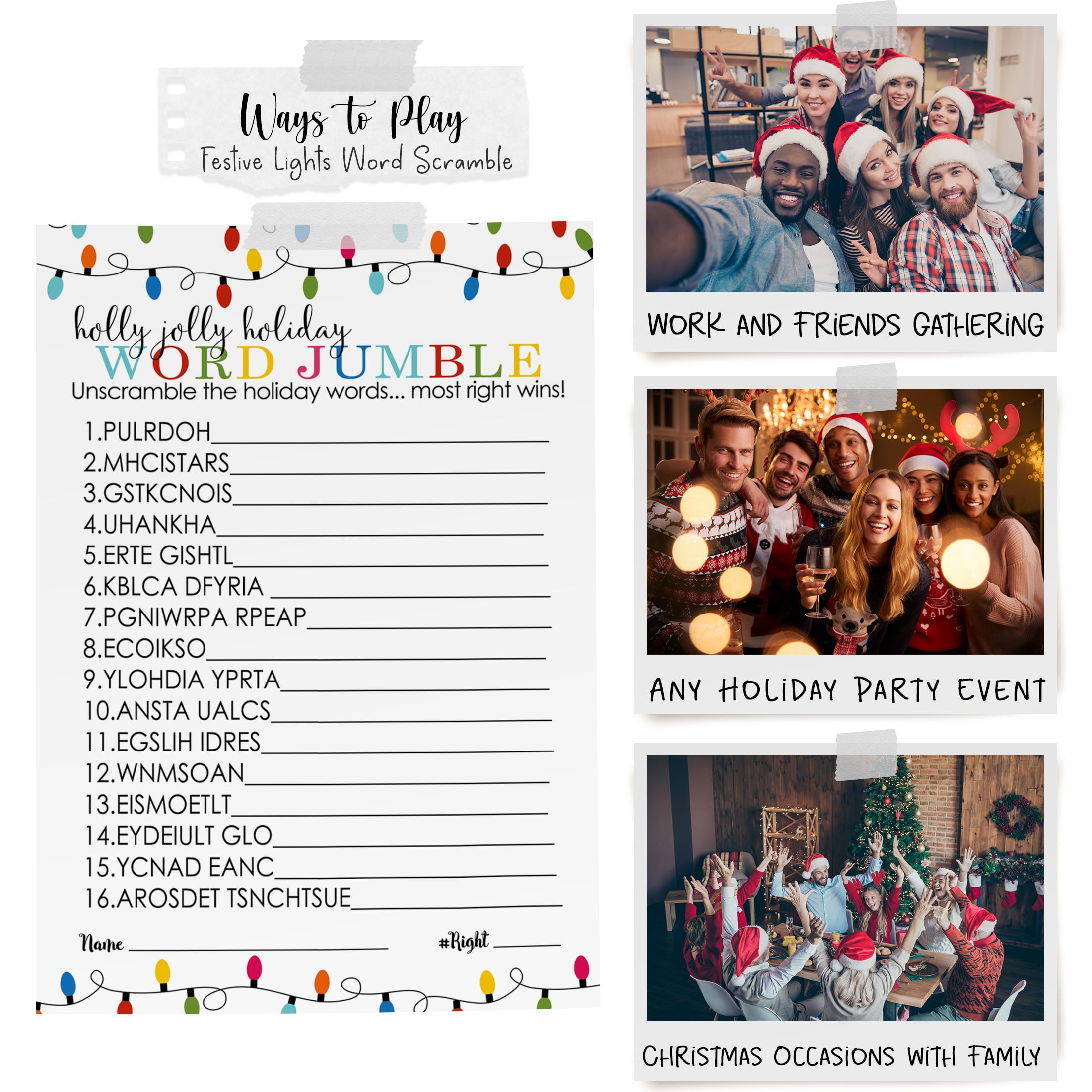 Festive Lights Christmas Word Scramble 25 Pack Unscramble Activity Cards For Adults Kids Groups Coworkers Family Colorful Holiday Supplies Printed 5x7 Size Set Paper Clever Party Walmart Com