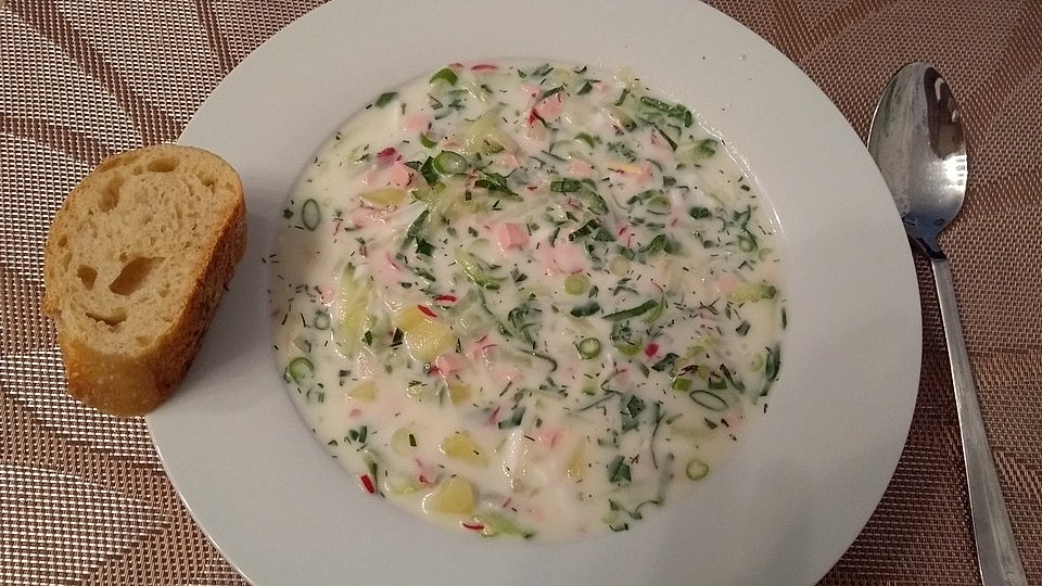 Web Zubereitungszeit 1 Stunde. Kalte Suppe mit Joghurt und Rucola. Das Rezept ist russischer Herkunft und eine herzhafte Variante zur Kaltschale im Sommer.